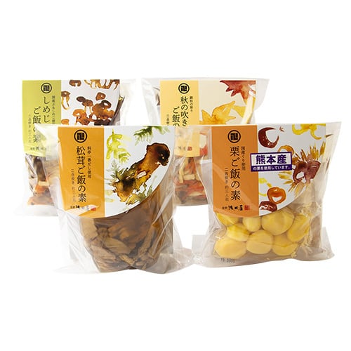 【秋の吹き寄せご飯の素】 [具]ぶなしめじ(国産)、人参、栗、薄揚げ、ぎんなん、むかご、塩、味醂、砂糖、醤油、風味原料(鰹節、昆布)/ 乳酸Ca、酸化防止剤(V.C)、クチナシ色素、漂白剤(亜硫酸塩)、(一部に小麦・大豆・やまいもを含む) [だし]塩、味醂、砂糖、醤油、風味原料(鰹節、昆布)、(一部に小麦・大豆を含む)